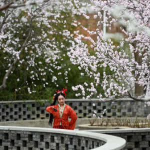 一名身着传统服饰的游客在桃花堤赏花拍照(3月14日摄)。