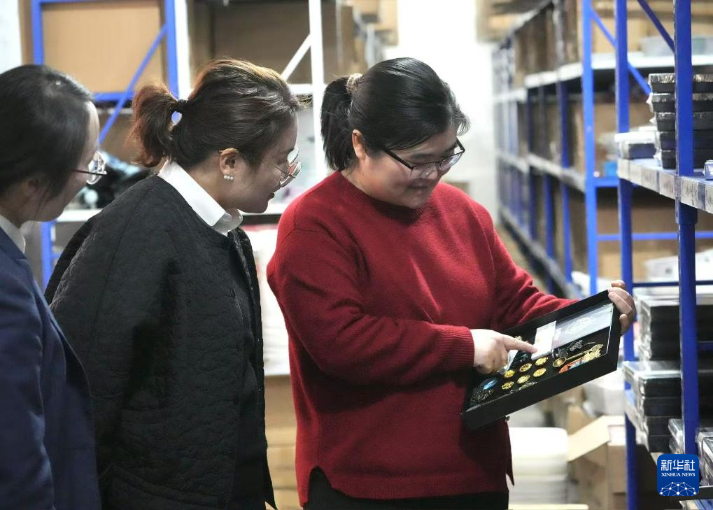 3月20日,在宁波素年工艺品有限公司,工作人员(右)向访客介绍文创礼盒。