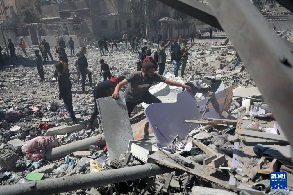 3月19日,在加沙地带北部加沙城的一处社区,人们在以军袭击后的废墟中寻找物品。