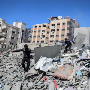 3月19日,在加沙地带北部加沙城的一处社区,人们在以军袭击后的废墟中搜寻。
