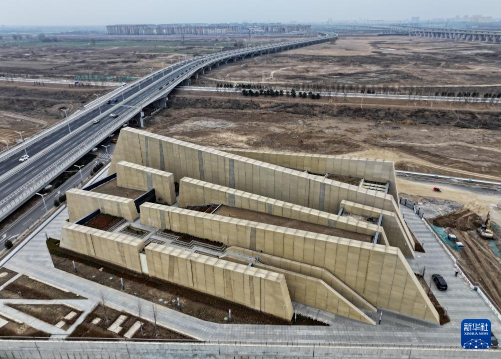 3月26日拍摄的河北雄安新区“智慧能源立方”——剧村220千伏变电站外景。该变电站屋顶覆土建设成公园,形成与城市融合共生的图景(无人机照片)。