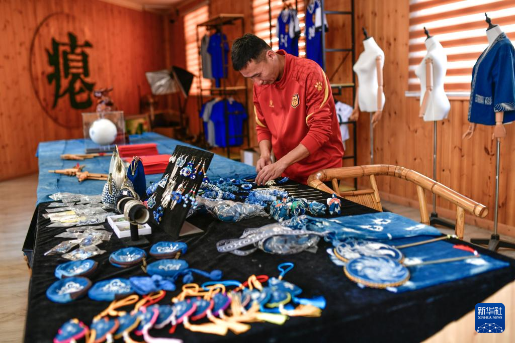董永恒在“村超”美食根据地餐馆展厅里整理文创产品(3月23日摄)。