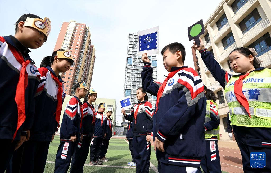 3月31日,河北省邯郸市邯山区农林路小学的学生在体验交通安全游戏,学习交通安全知识。