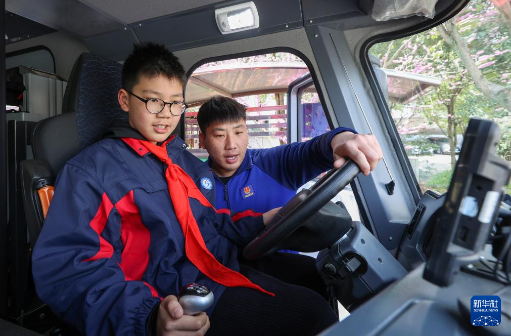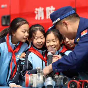 3月31日,浙江省湖州市吴兴区埭溪镇上强小学的学生在埭溪镇消防综合应急救援队队员的指导下了解消防车的构造。