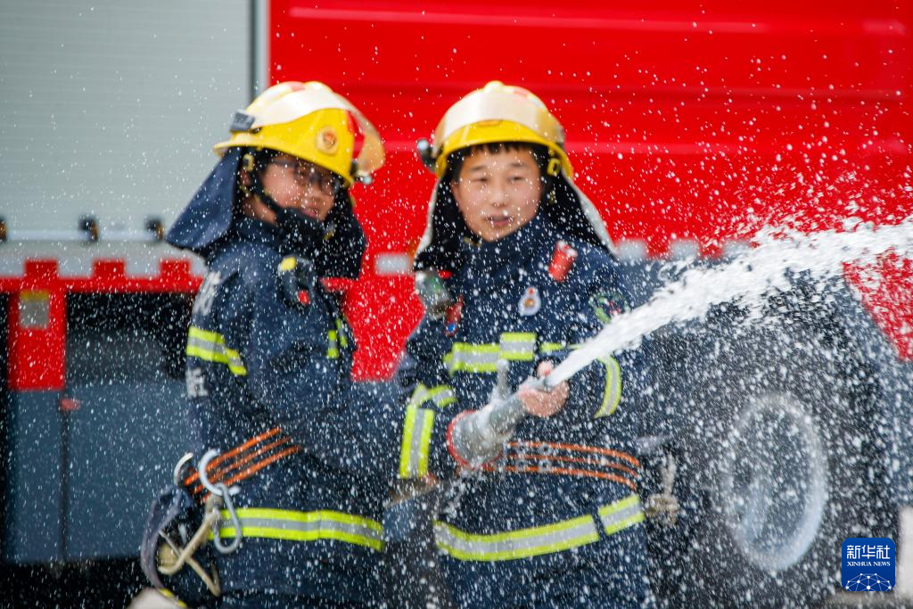 3月31日,在河南省商丘市睢县凤翔九年一贯制学校内,小学生(左)在消防员的指导下体验使用消防水枪。