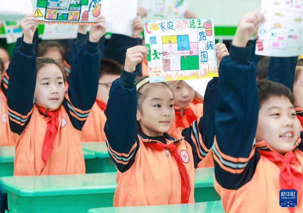 3月31日,山东省滕州市北辛街道通盛路小学学生展示制作的家庭消防逃生路线图。