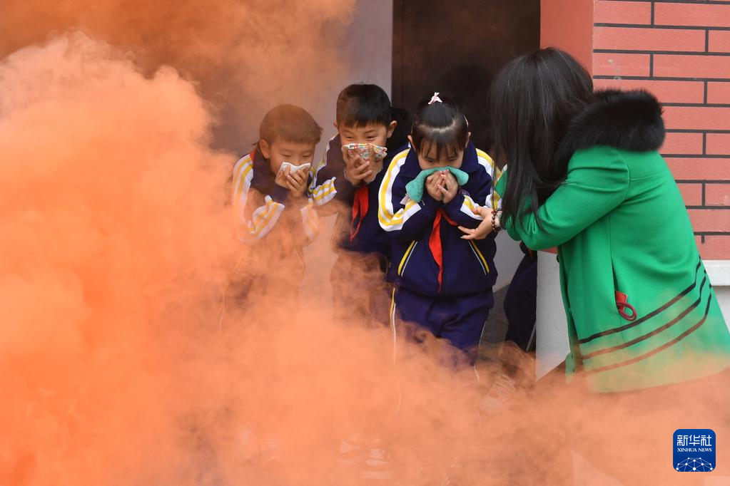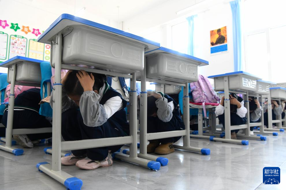 3月31日,黑龙江省绥化市北林区雷锋小学的学生进行地震灾害应急演练。