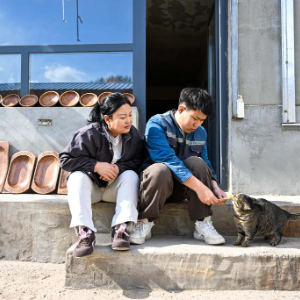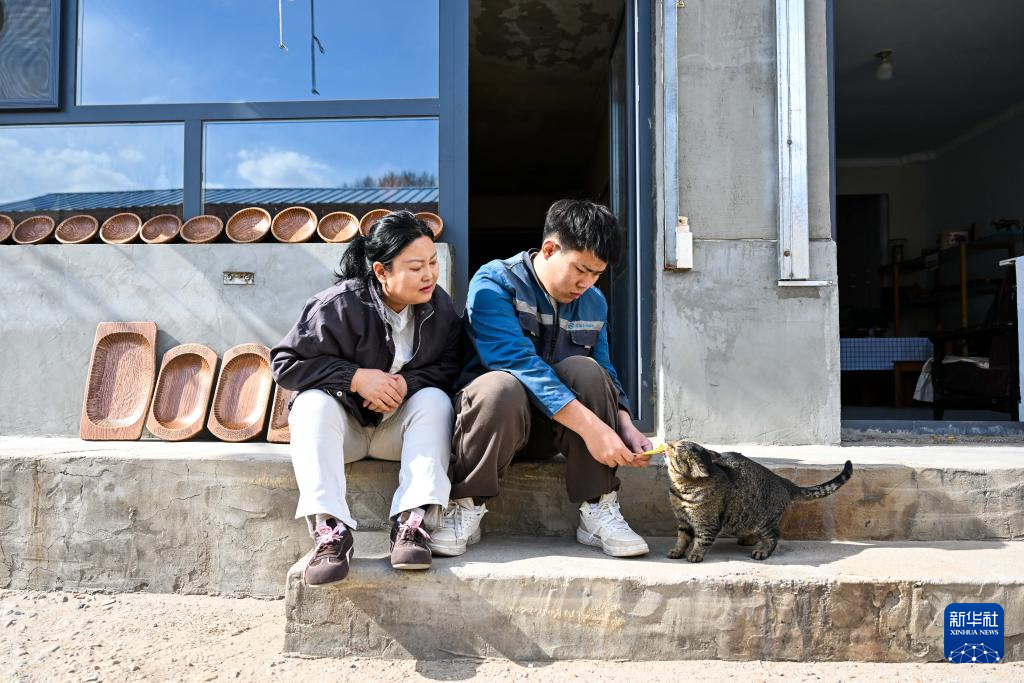 3月31日,在位于呼和浩特市赛罕区的一家木雕工作室,胡日(右)与母亲乌尼尔其其格一起给小猫喂食。