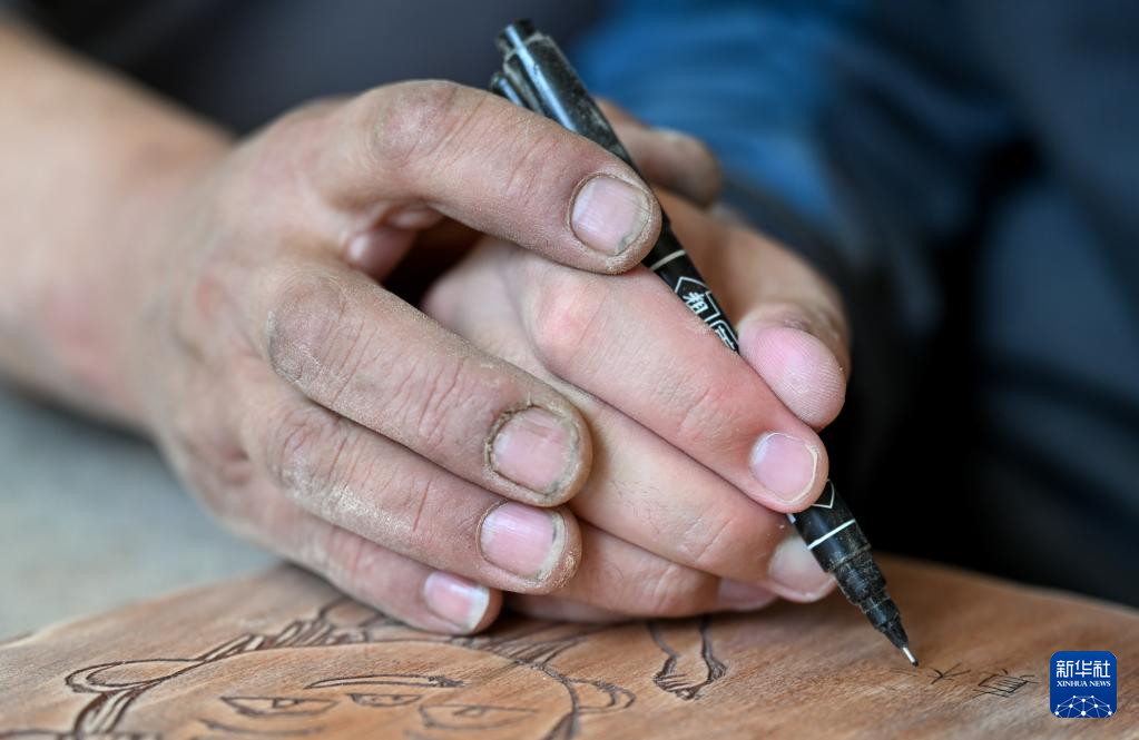 3月31日,在位于呼和浩特市赛罕区的一家木雕工作室,胡日在制作木盘。