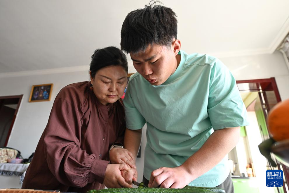 3月30日,在位于呼和浩特市新城区的家中,乌尼尔其其格(左)协助儿子胡日切黄瓜。