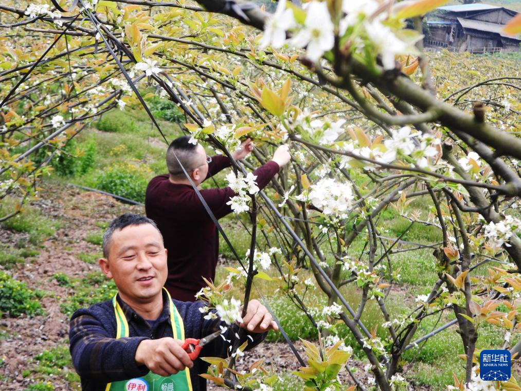 4月4日,果农在四川省达州高新区金垭镇金山村果园对梨树剪枝和疏花。
