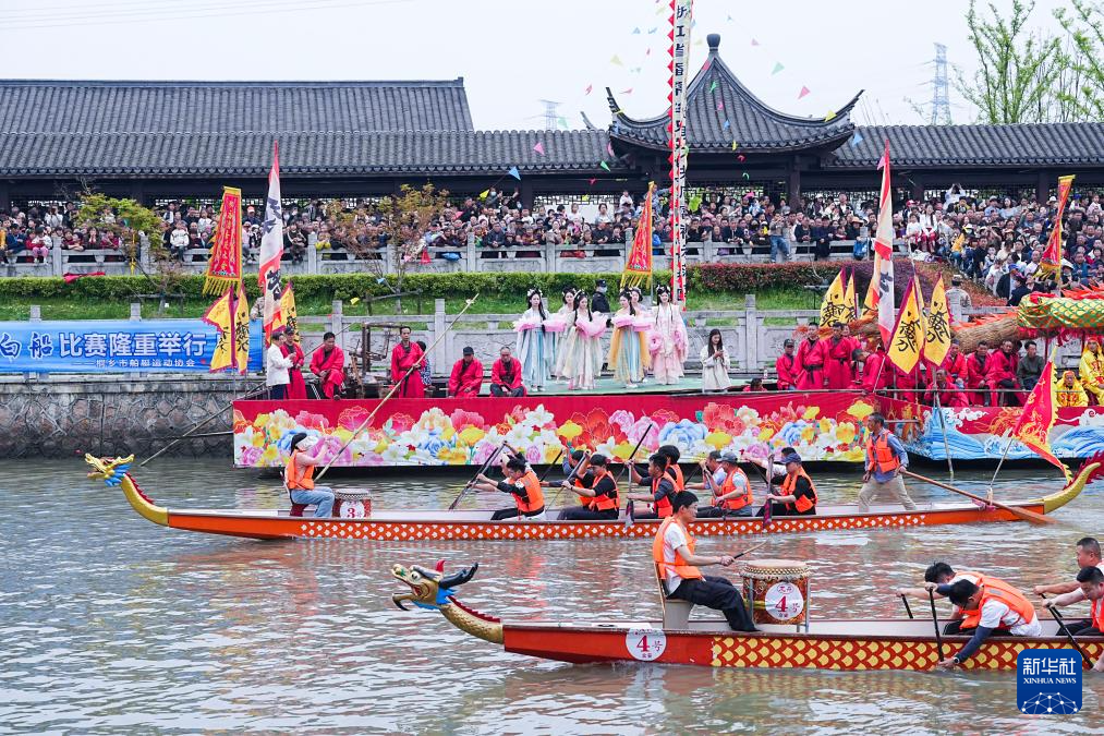 这是洲泉镇2025春季“双庙渚蚕花水会”上举行的龙舟竞渡活动(4月4日摄)。