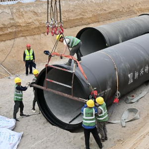 4月9日,中铁十二局工人在雄安干渠工程二标段建设现场安装输水管道。