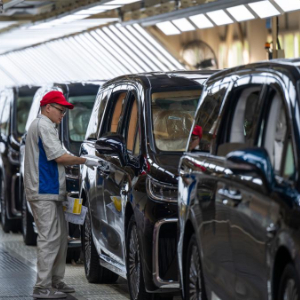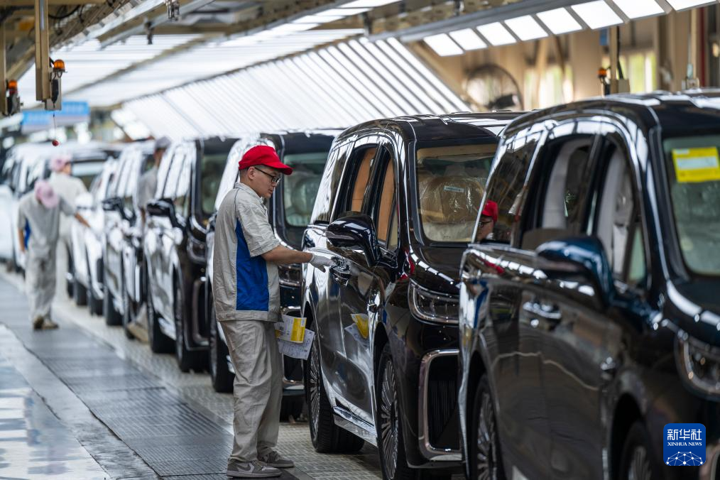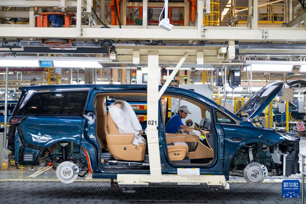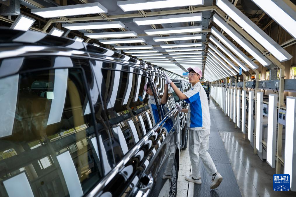 4月9日,在位于湖北武汉经开区的岚图汽车数字化总装车间,工人在流水线上作业。