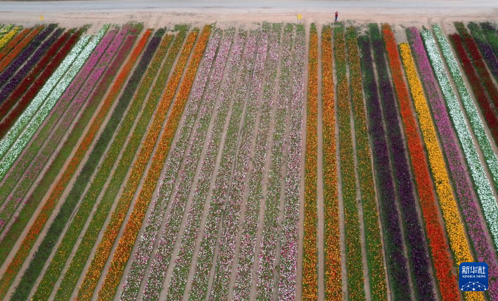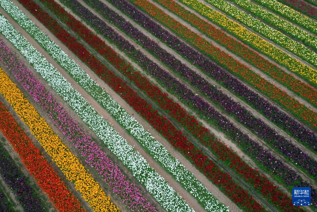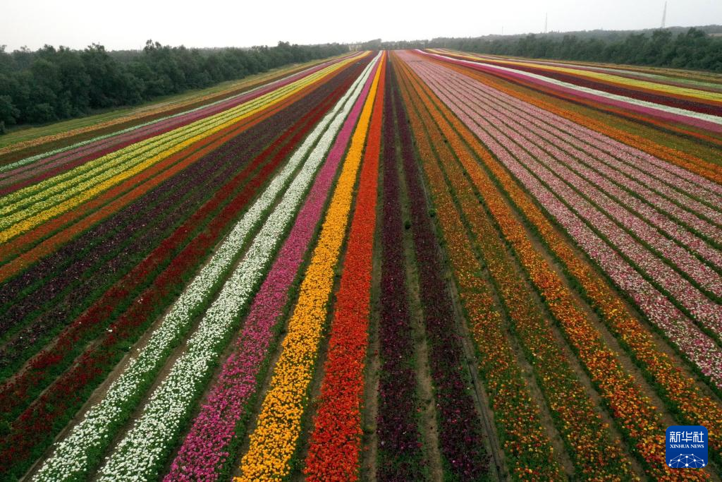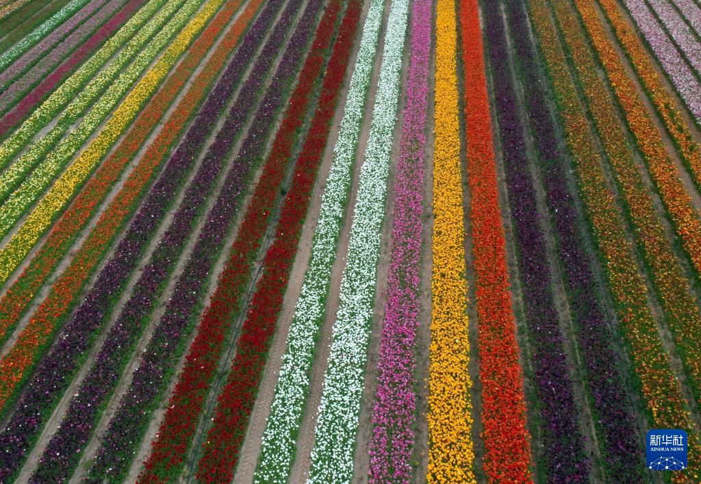 这是4月8日在以色列南部霍利特集体农庄拍摄的毛茛花田(无人机照片)。