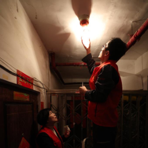 4月11日,在福康社区一楼道内,马凤侠(左)和志愿者在换灯泡。