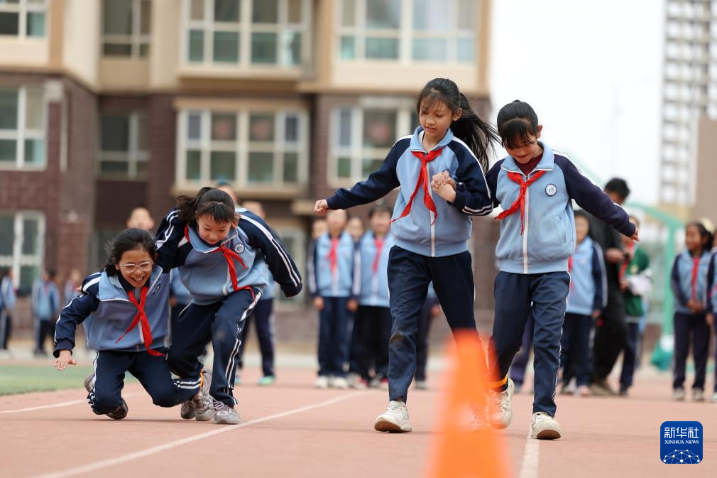 这是学生在操场上的“AI运动小站”练习开合跳(4月11日摄)。