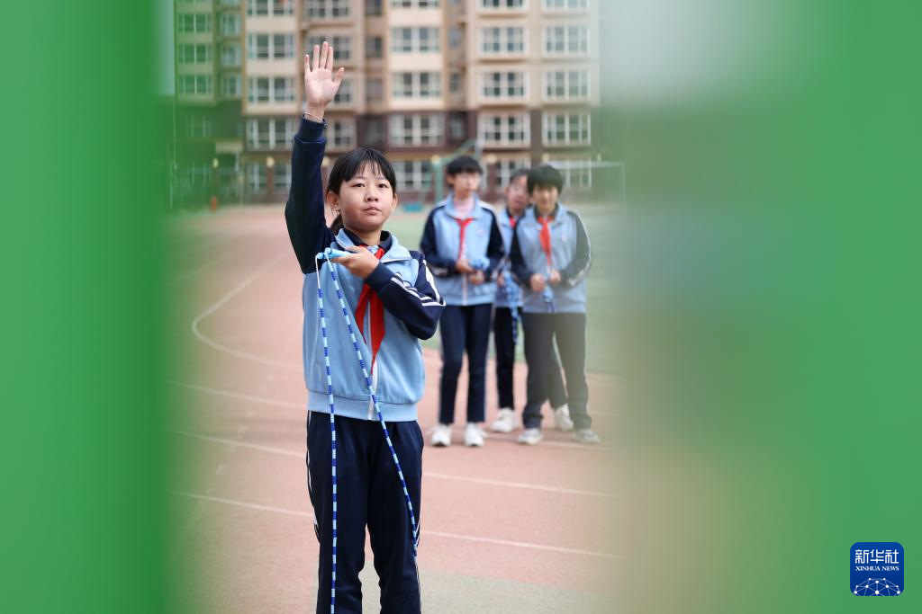 这是学生在操场上的“AI运动小站”练习跳绳(4月11日摄)。