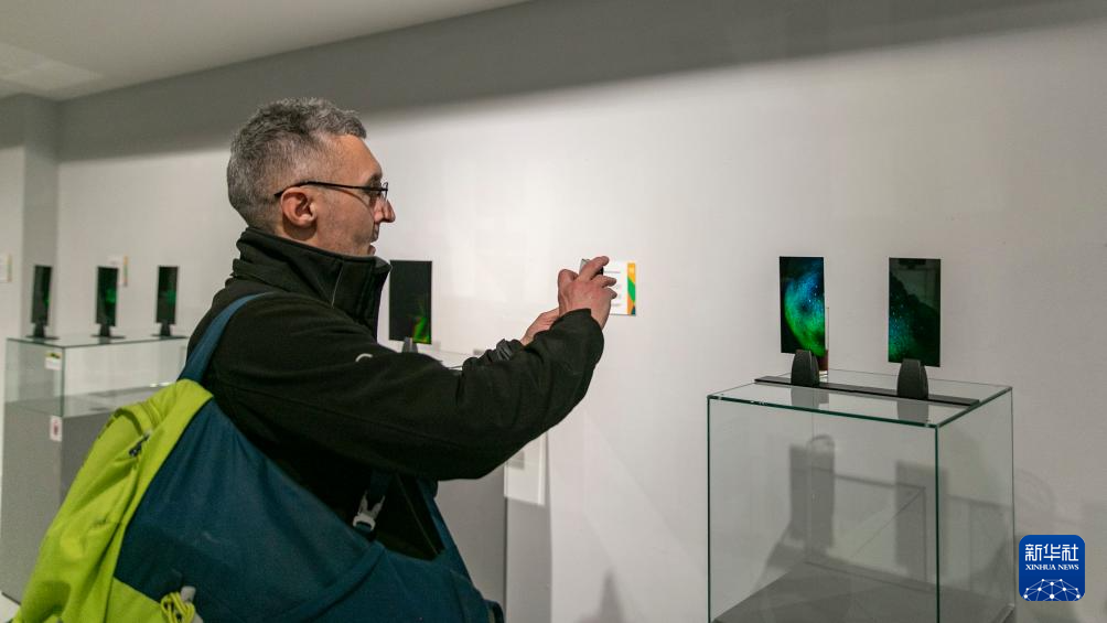 4月10日,在塞尔维亚贝尔格莱德举行的“光印——中塞友谊70载全息影像特展”上,观众在全息作品前驻足观看。