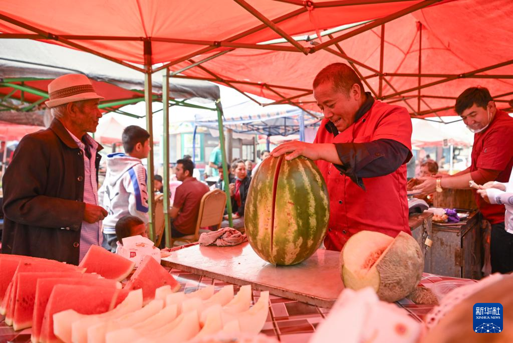 4月13日,一位商贩在新疆于田县先拜巴扎镇农牧民运动场为顾客制作面食。