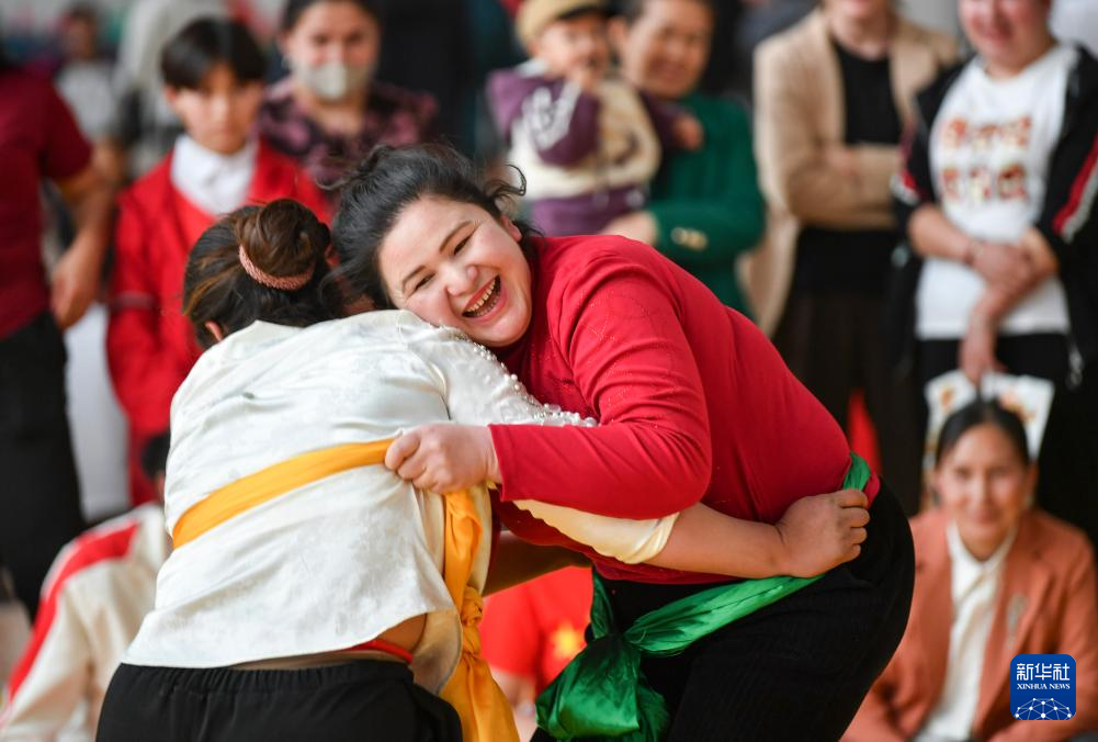 4月12日,村民在新疆于田县全民健身中心参加女子摔跤比赛。