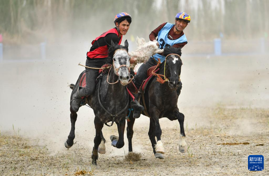 4月12日,村民在新疆于田县先拜巴扎镇农牧民运动场参加叼羊比赛。