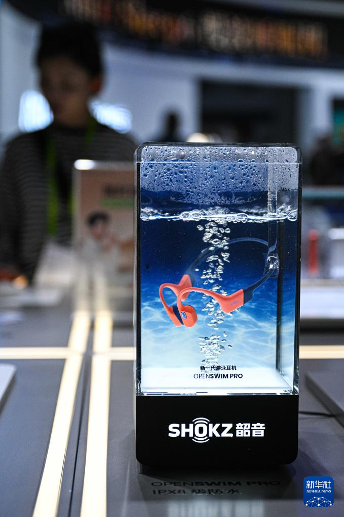 4月15日在第五届消博会韶音展台拍摄的新一代游泳耳机。