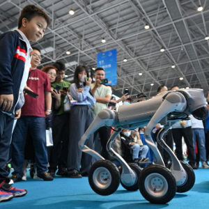 4月16日,观众在消博会现场观看国产机器狗展示技能。