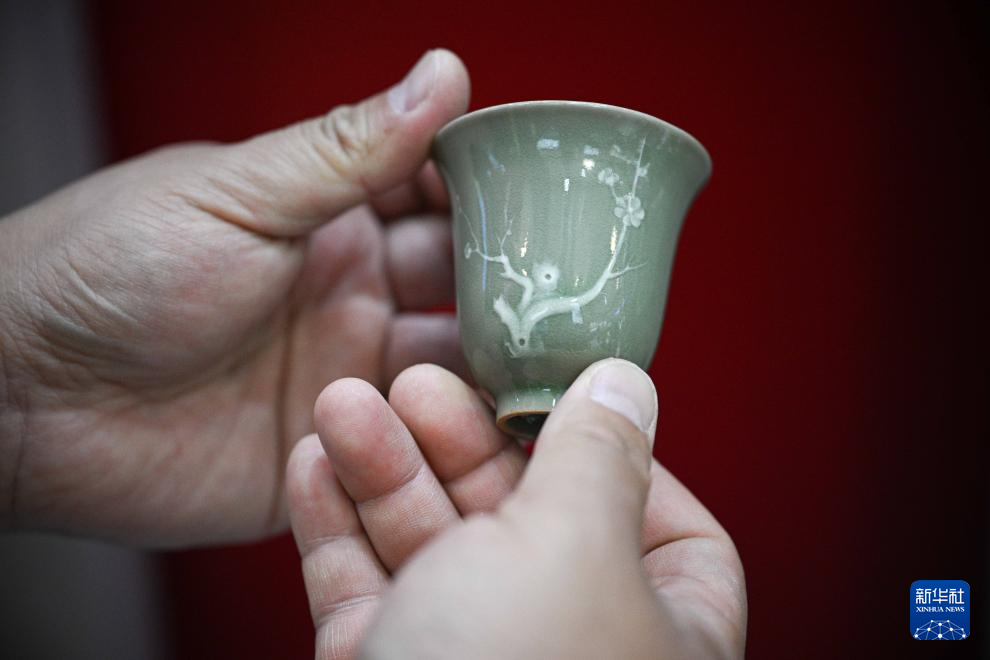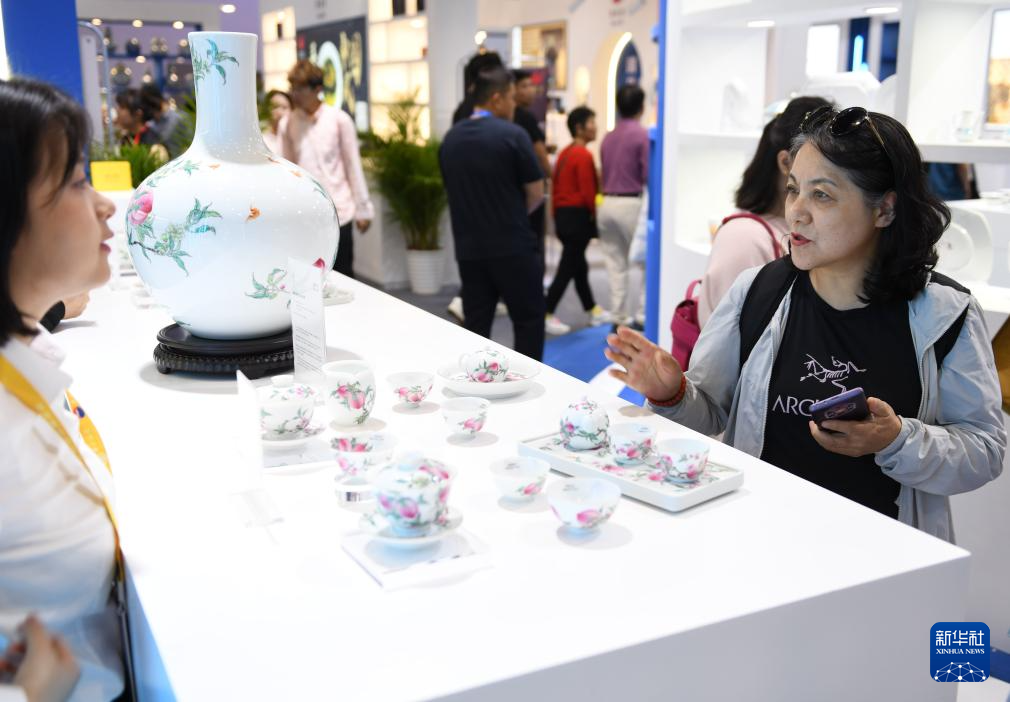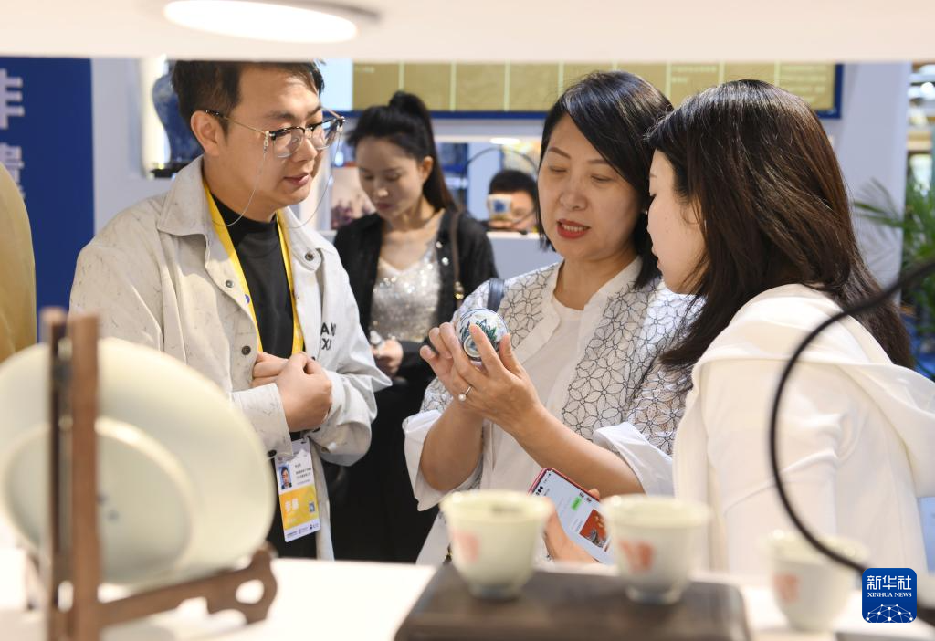 4月15日,工作人员在第五届消博会陕西馆展示耀州窑瓷器。耀州窑陶瓷烧制技艺是国家级非物质文化遗产。
