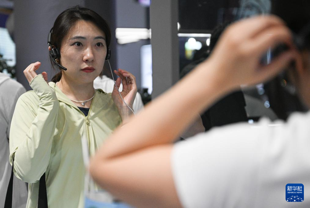 4月15日,观众在第五届消博会韶音展台试戴耳机。