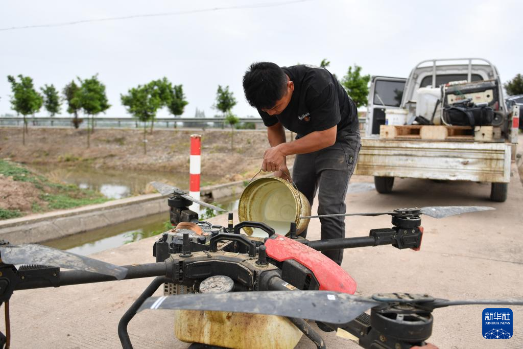 4月16日,在大通湖区河坝镇王家湖村,邱彬将除草剂倒入植保无人机中准备作业。