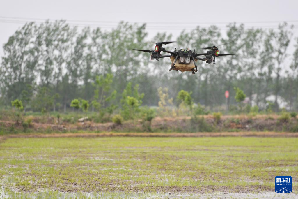 4月16日,在大通湖区河坝镇王家湖村,邱彬操作植保无人机喷洒除草剂。