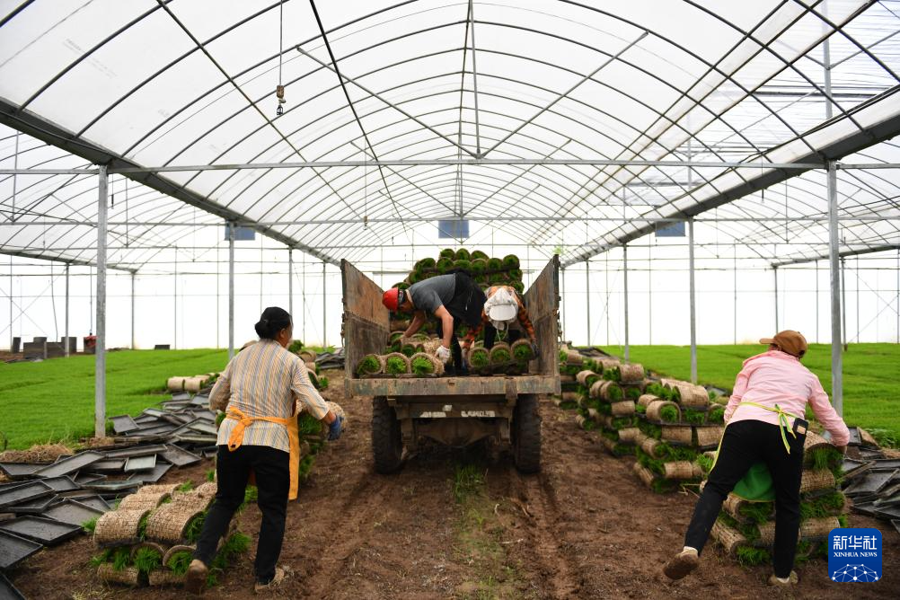 4月16日,村民在大通湖区河坝镇新秀村育秧大棚内将秧苗装车。