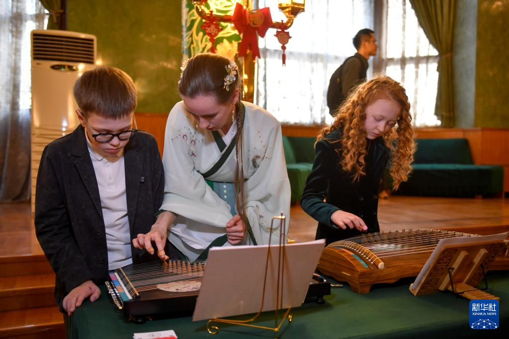 4月20日,学生在俄罗斯首都莫斯科举行的“国际中文日”活动上体验中国民族乐器。