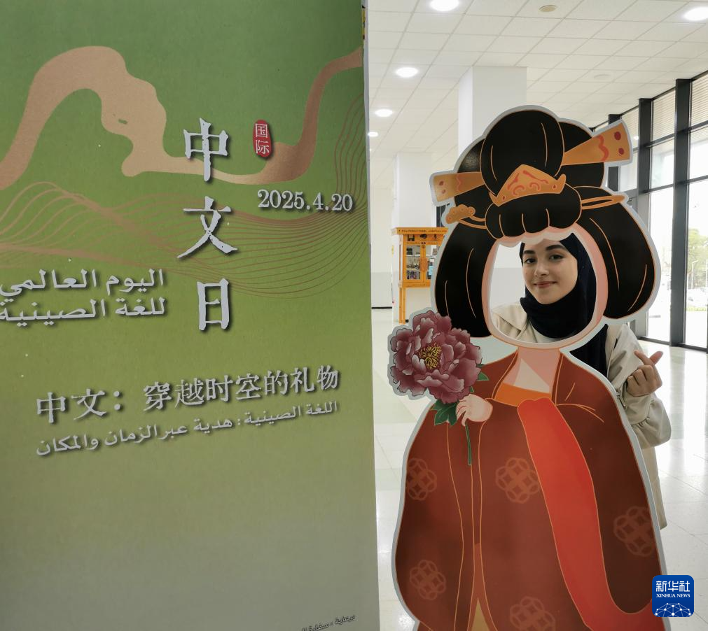 4月20日,在阿尔及利亚阿尔及尔举行的“国际中文日”活动上,学生与中国传统服饰展板合影。