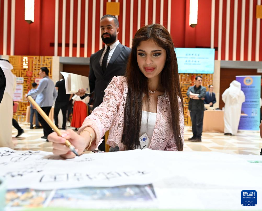 4月20日,参与者在科威特哈瓦利省举行的“国际中文日”暨使馆开放日活动中体验中国书法。