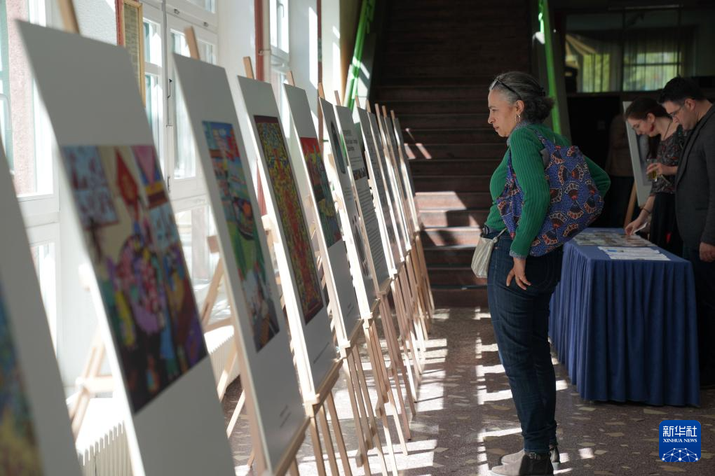 4月19日,一名女孩在波黑萨拉热窝举行的甘肃民间艺术展上挑选明信片。为庆祝“国际中文日”,以“中国非遗 世界共享”为主题的甘肃民间艺术展当天在波黑萨拉热窝大学哲学院开幕。