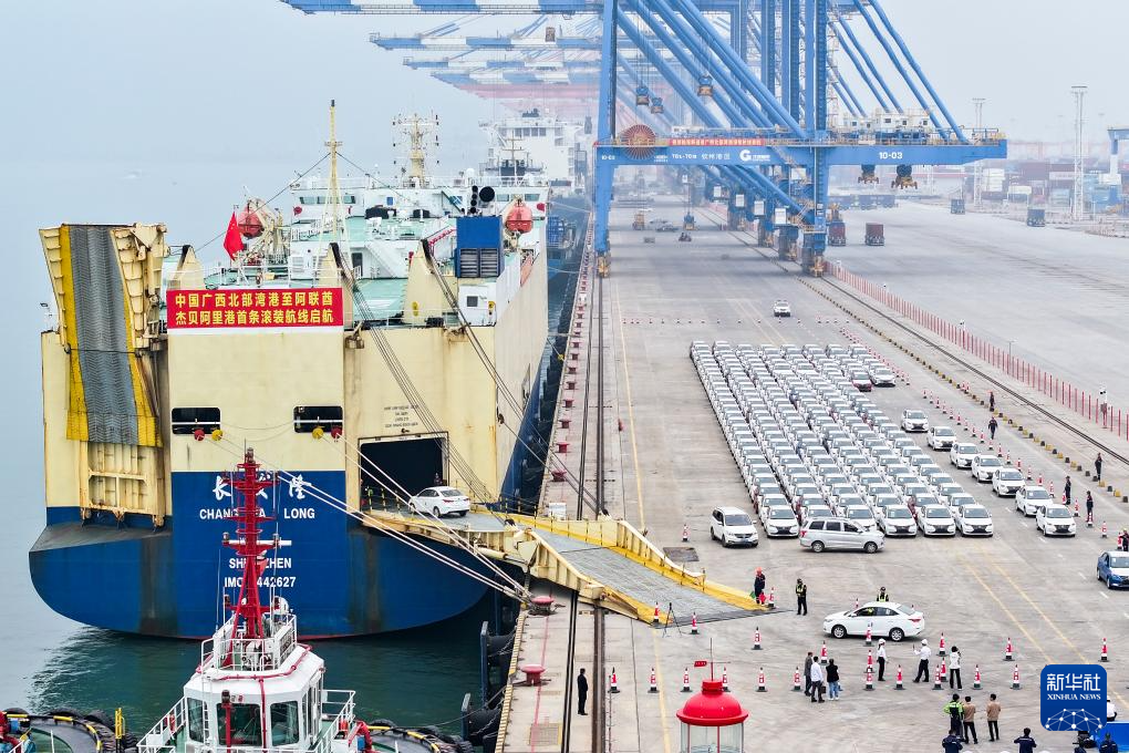 4月7日,在广西钦州港码头泊位,一艘滚装船在进行装船作业。这艘搭载着汽车的滚装船从广西钦州港出发,驶向中东贸易枢纽迪拜杰贝阿里港,这些汽车使用的玻璃均来自西部地区的玻璃生产企业。