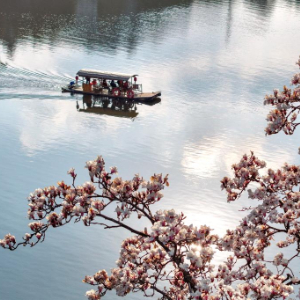 3月6日在安徽省黄山市歙县新安江畔拍摄的玉兰花(无人机照片)。