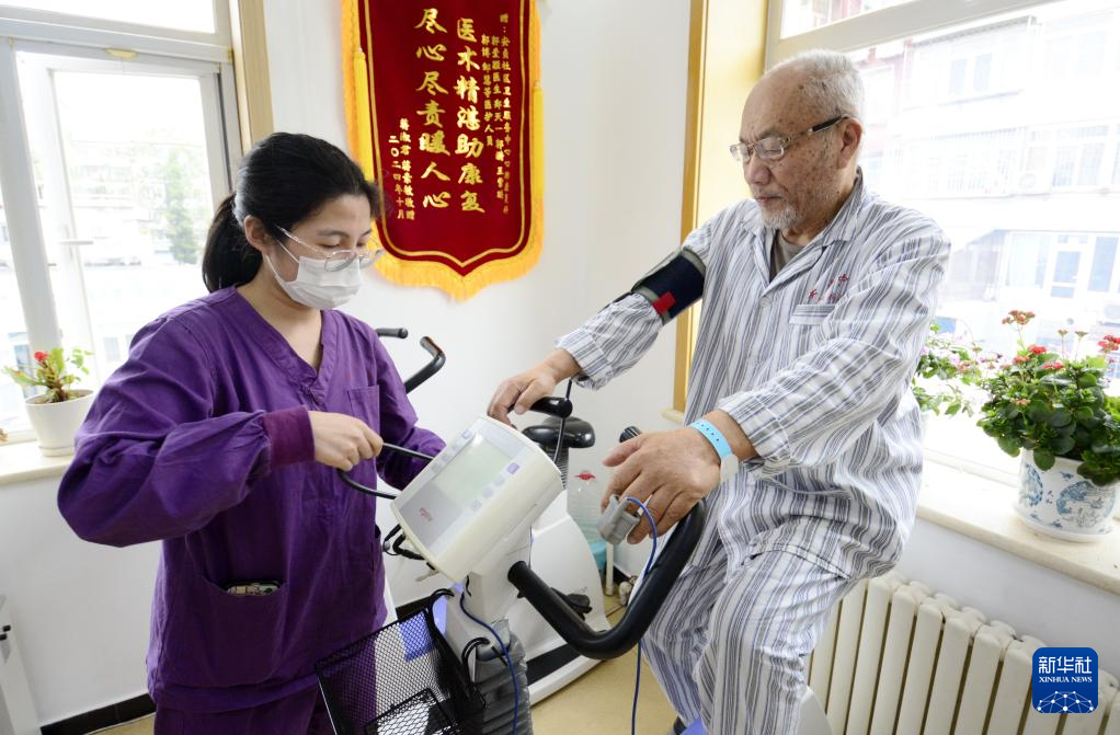 4月21日,一位高龄社区居民在朝阳区安贞社区卫生服务中心进行心肺功能康复训练。