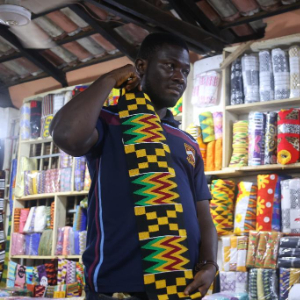 3月12日,在加纳阿散蒂省库马西市,一名男子在商店内展示“肯特布”。