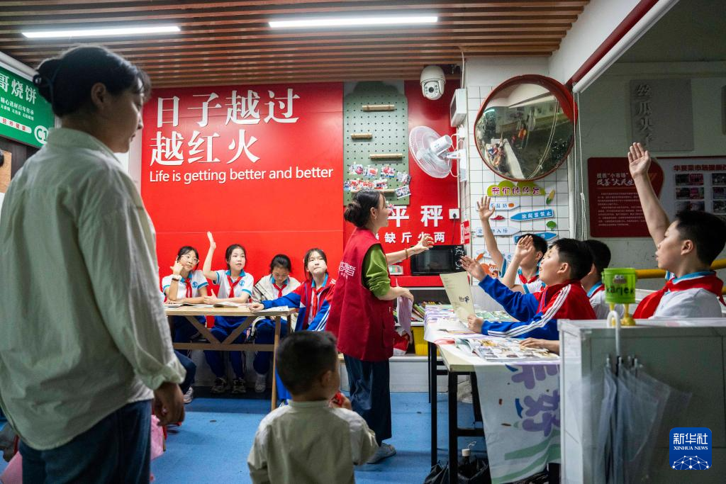 4月23日,志愿者在长沙华夏农贸市场“四点半角”带领学生阅读书籍。