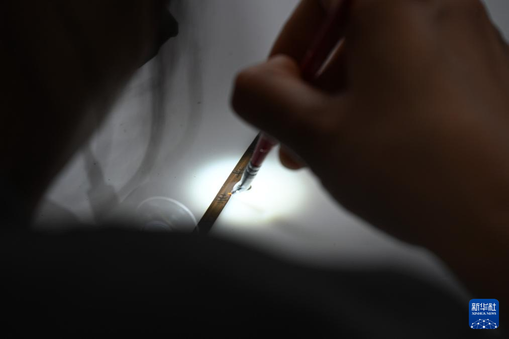 4月24日,荆州文物保护中心简牍工作室的工作人员在清理简牍。