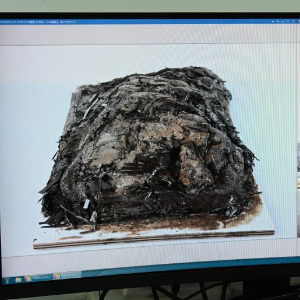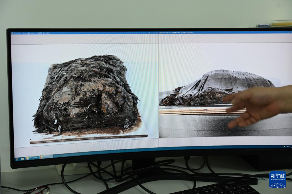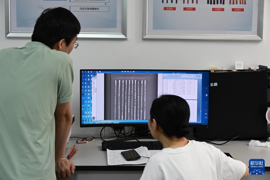 4月24日,主持“饱水简牍墨迹化学显影新技术研发与应用”项目的魏栋副教授(左)与工作人员检查扫描后的竹简文字。