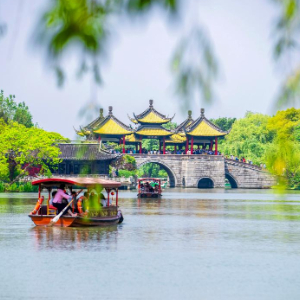 4月30日,游客在江苏扬州瘦西湖风景区乘船游览(无人机照片)。