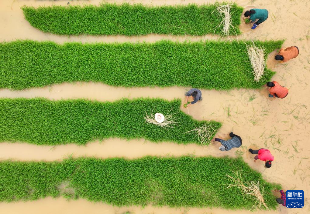 4月30日,在衡山县萱洲镇,当地村民在起秧苗(无人机照片)。