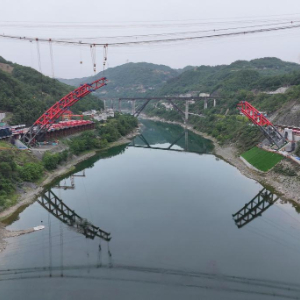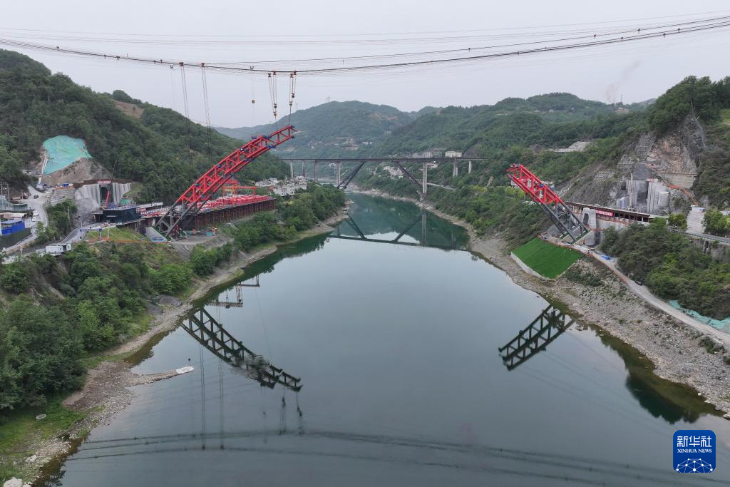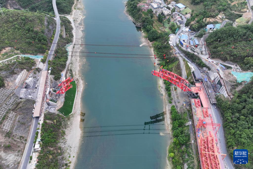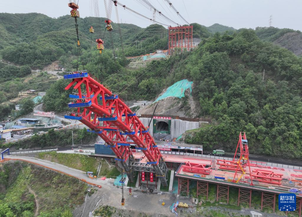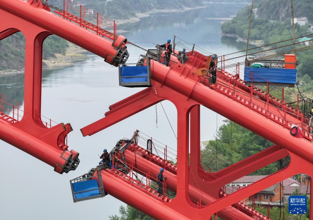 4月29日拍摄的西渝高铁安康汉江大桥钢拱安装建设现场(无人机照片)。