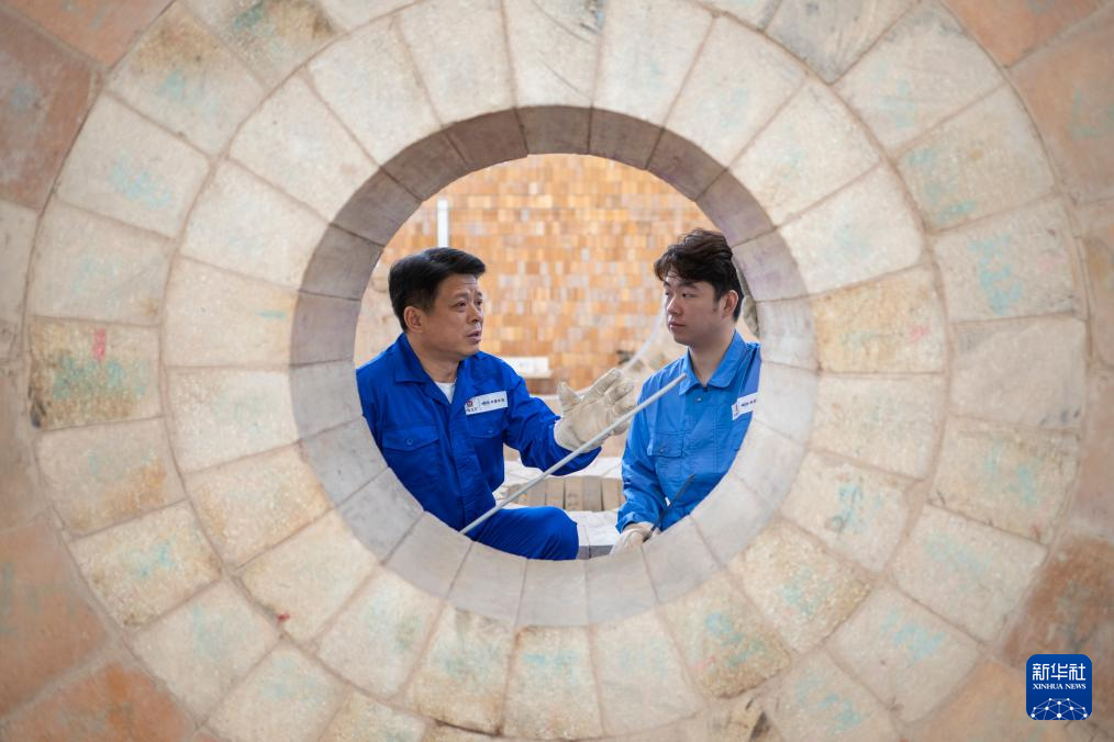 4月25日,吴春桥(右)与工作室成员操作耐火材料实验设备。