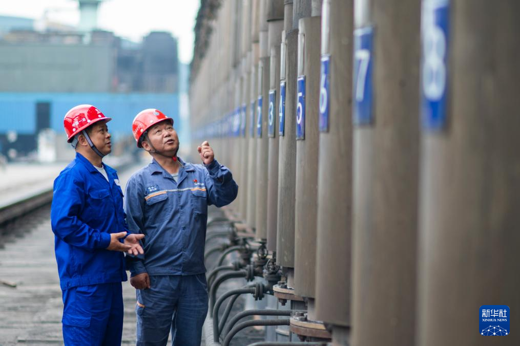 4月27日,在吴春桥参建过的武钢一座焦炉炉顶,吴春桥(左)与宝武集团武钢有限焦化公司机械技能大师龚九宏查看焦炉炉顶上升管工作状态。