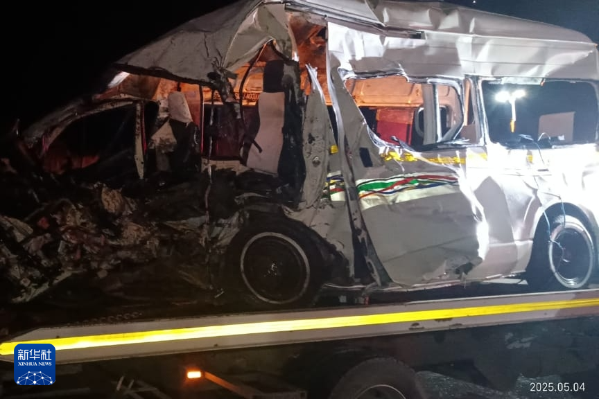 这是5月4日在南非东开普敦省事故现场拍摄的严重损毁的小巴。